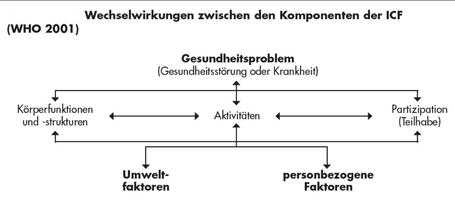 Im Sinne der ICF und des bio-psycho-sozialen Modells werden die Wechselwirkungen mit den Kontextfaktoren ebenfalls in den Blick genommen und gegebenenfalls dokumentiert.