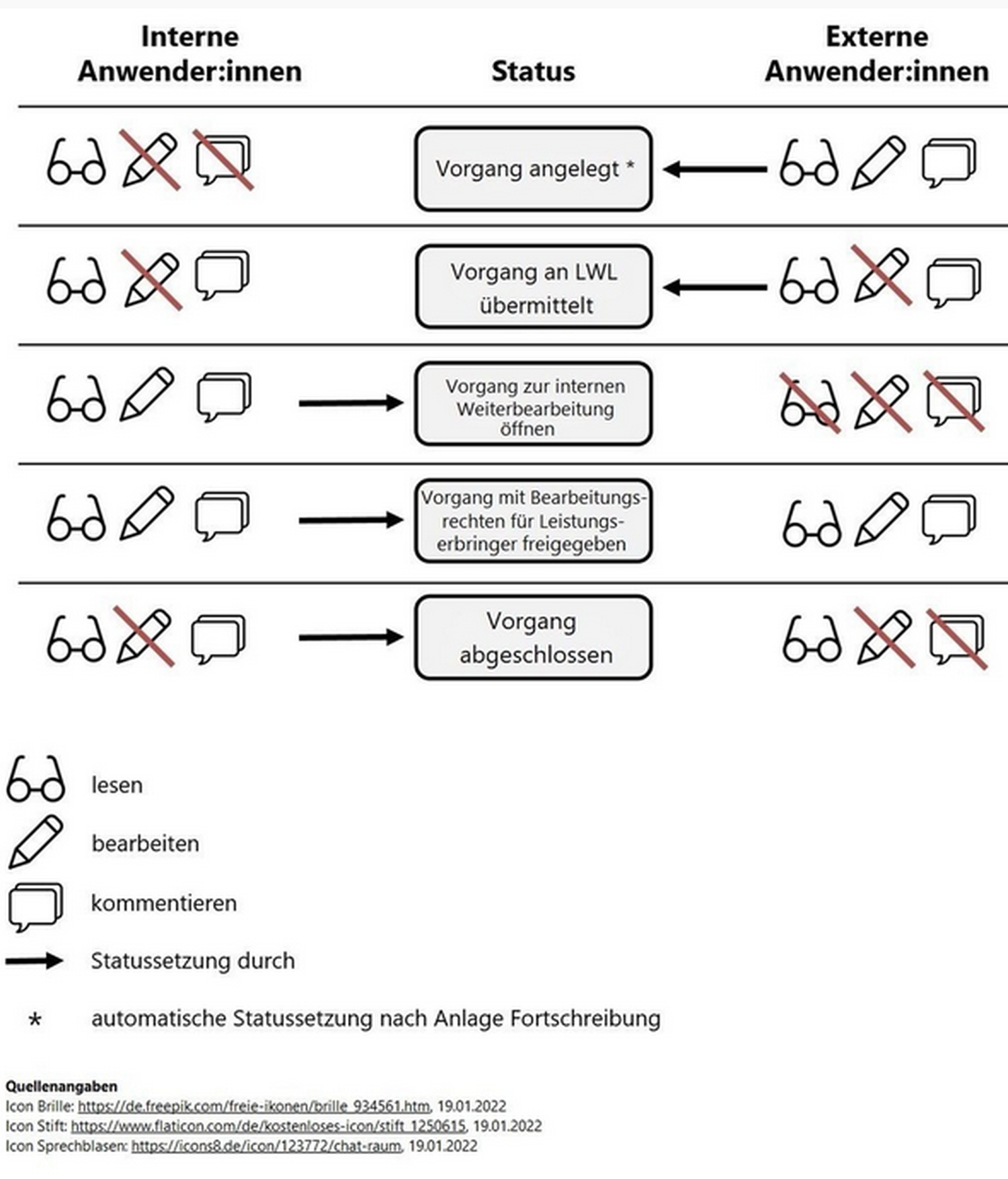 Die folgende Grafik veranschaulicht, wie sich Lese-, Bearbeitungs- und Kommentierungsrechte im Verlauf der einzelnen Status – ausgehend von einer Anlage des Vorgangs durch externe Anwendende – entwickeln.