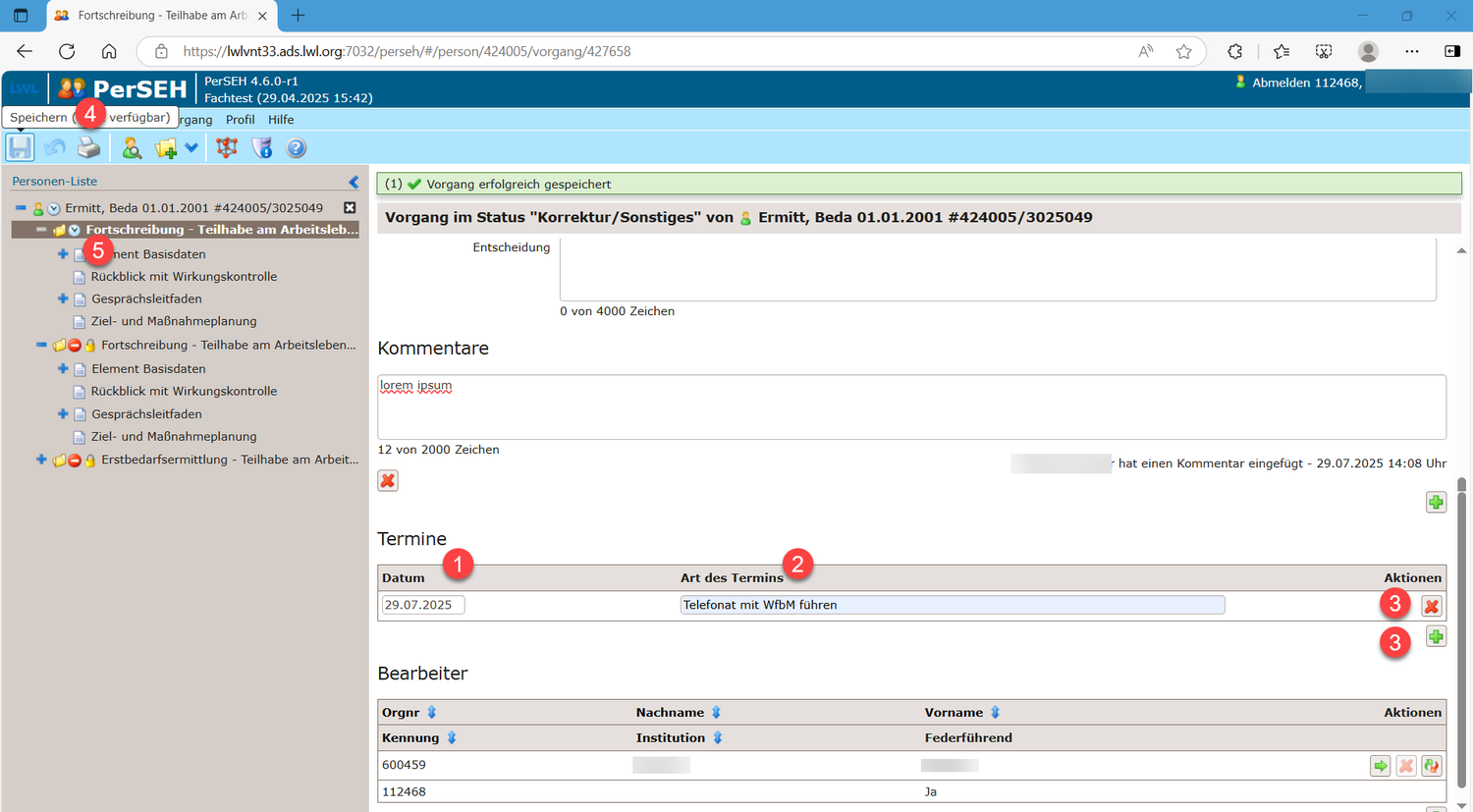 Es erfolgt ein Wechsel auf die Vorgangsebene. In der Informationsmeldung (1) wird die erfolgreiche Statusänderung angezeigt. Mit der Übermittlung an den LWL wird ein Dokument mit allen Seiten dieses Vorgangs erzeugt und in der elektronischen Akte der leistungsberechtigten Person beim LWL-Inklusionsamt Arbeit abgelegt. Gleichzeitig werden die Bearbeitungsrechte in PerSEH auf die zuvor ausgewählte zuständige Person der Teilhabeplanung beim LWL übertragen. Dies bedeutet: Der Vorgang ist für eine externe Bearbeitung von Eingabefeldern des Vorgangs gesperrt. Lediglich auf der Vorgangsebene können in diesem Status Kommentare (2) und Termine (3) bearbeitet werden. Die Sperrung wird durch das Symbol "Verbot der Einfahrt (4)" im Modulmenü für den betreffenden Vorgang visualisiert.