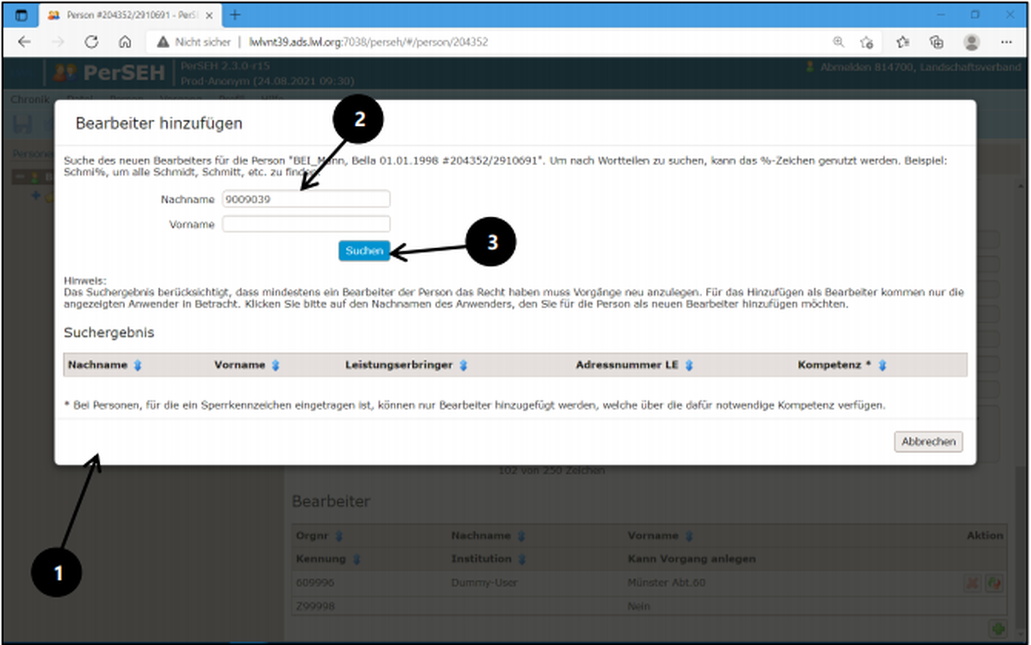 Die Zuweisung der Datensätze einer leistungsberechtigten Person zu einem Leistungserbringer erfolgt über die sogenannten Dispatcher. Der Dispatcher mit seiner jeweiligen ZAD-Nummer (900....) repräsentiert technisch die Einrichtung im Programm PerSEH. Die Zuordnung erfolgt auf der Personenebene (1) am Ende der Seite unter der Überschrift Bearbeiter (2). Das grüne Plus-Symbol (3) mit dem Hinweis Bearbeiter hinzufügen ist zu wählen.