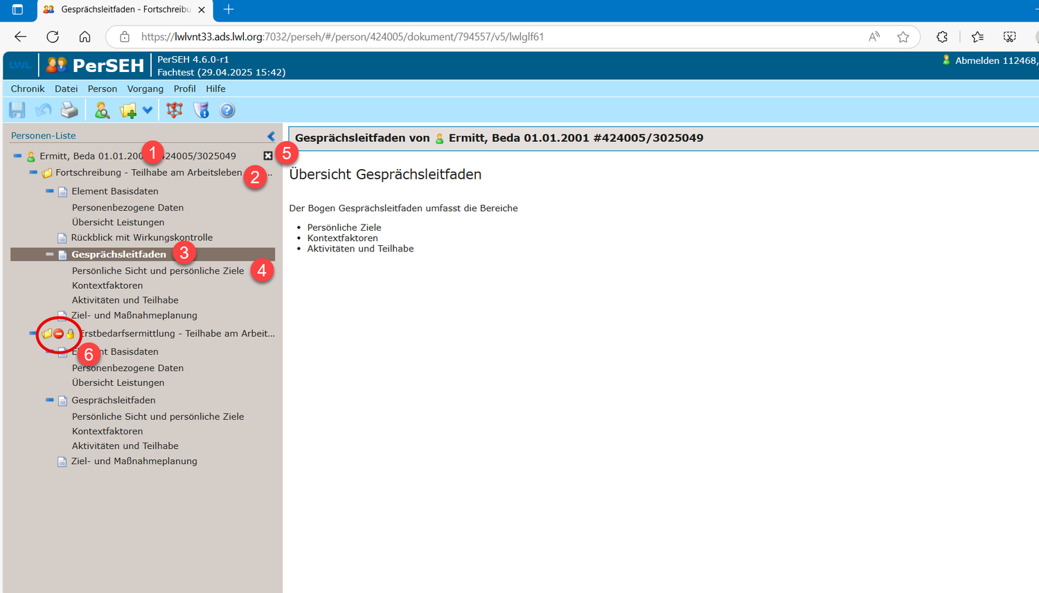 Im Inhaltsbereich (1) der Personenebene (2) generiert das Programm PerSEH automatisch die sogenannten Personendaten aus den beim LWL hinterlegten Daten. Personendaten sind nicht änderbar. Diese Daten können ausschließlich von LWL-Mitarbeitenden im führenden Datenverarbeitungsverfahren ANLEI beim LWL gepflegt werden.
